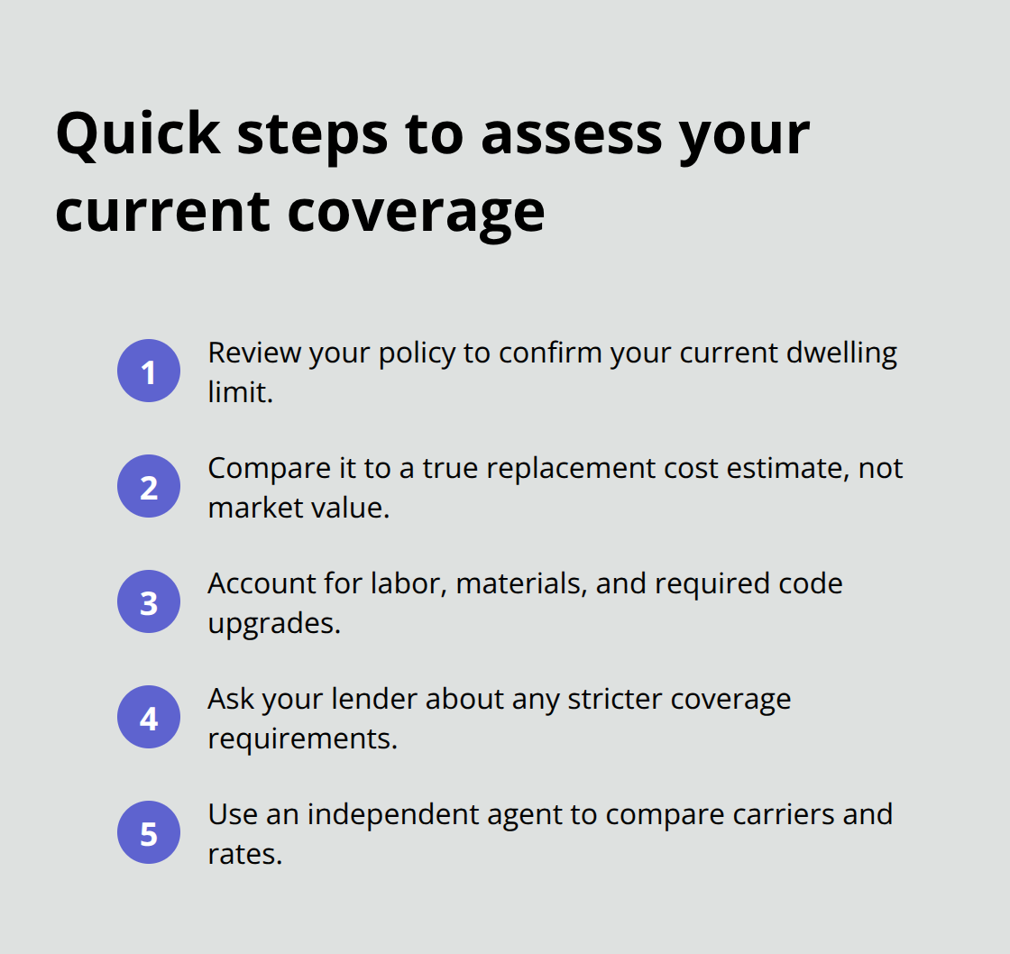 Start by reviewing your existing policy documents to identify what your current dwelling coverage actually covers. Compare that figure against your home’s true replacement cost-not its market value, which often differs significantly. Many homeowners underestimate replacement costs because they don’t account for labor, materials, and code upgrades required after a loss.